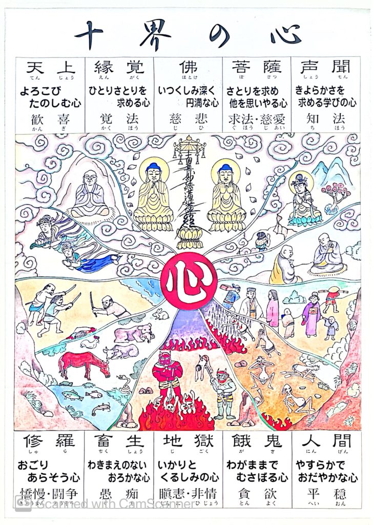 Nichiren Buddhism (including Nichiren Shu) emphasizes this concept deeply, asserting that all ten realms exist simultaneously within every moment of life, a principle known as The Mutual Possession of the Ten Worlds (十界互具 – jikkai gogu). This means that even the state of Buddhahood is inherent in a person experiencing the torments of Hell, and vice versa. Our current state is determined by the dominant thought or condition of our lives at any given moment.